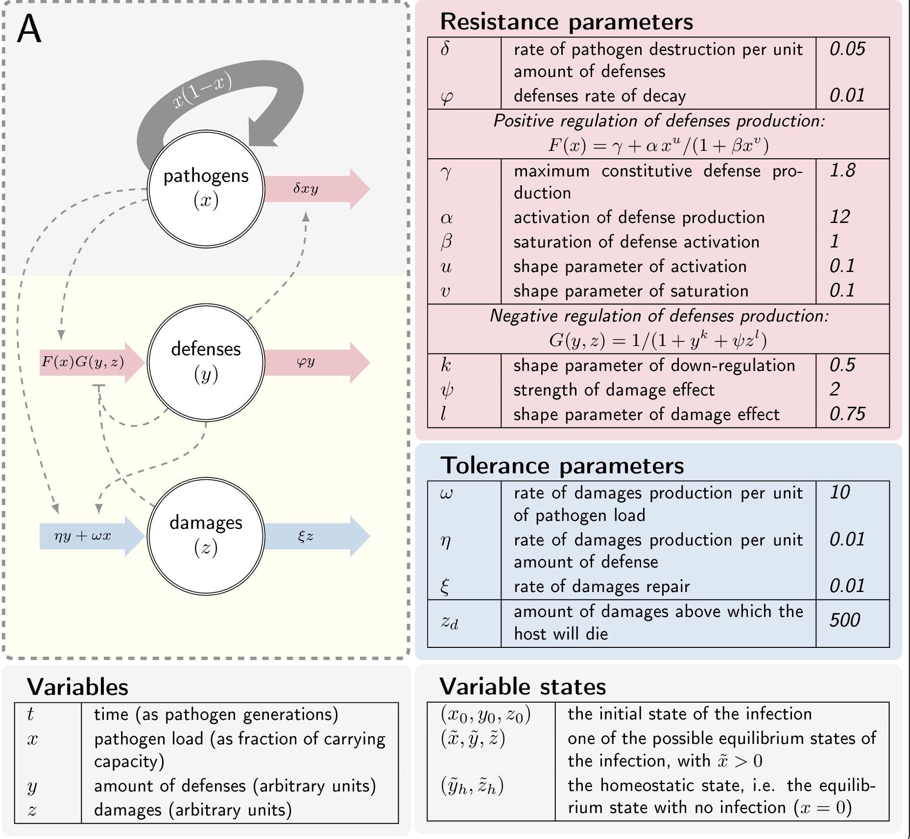 In collaboration with Jean-Baptiste Ferdy, we used theoretical models and experimental approaches to define more specifically the parameters of infection and determine their role in the two strategies to survive an infection (i.e. controlling the infection — resistance — versus tolerating the damage linked to the infection — disease tolerance) Duneau et al. eLife 2025. This work aims to describe precisely the dynamics of bacteria interacting with their hosts, to characterize the relevant parameters, and to compare dynamics statistically.