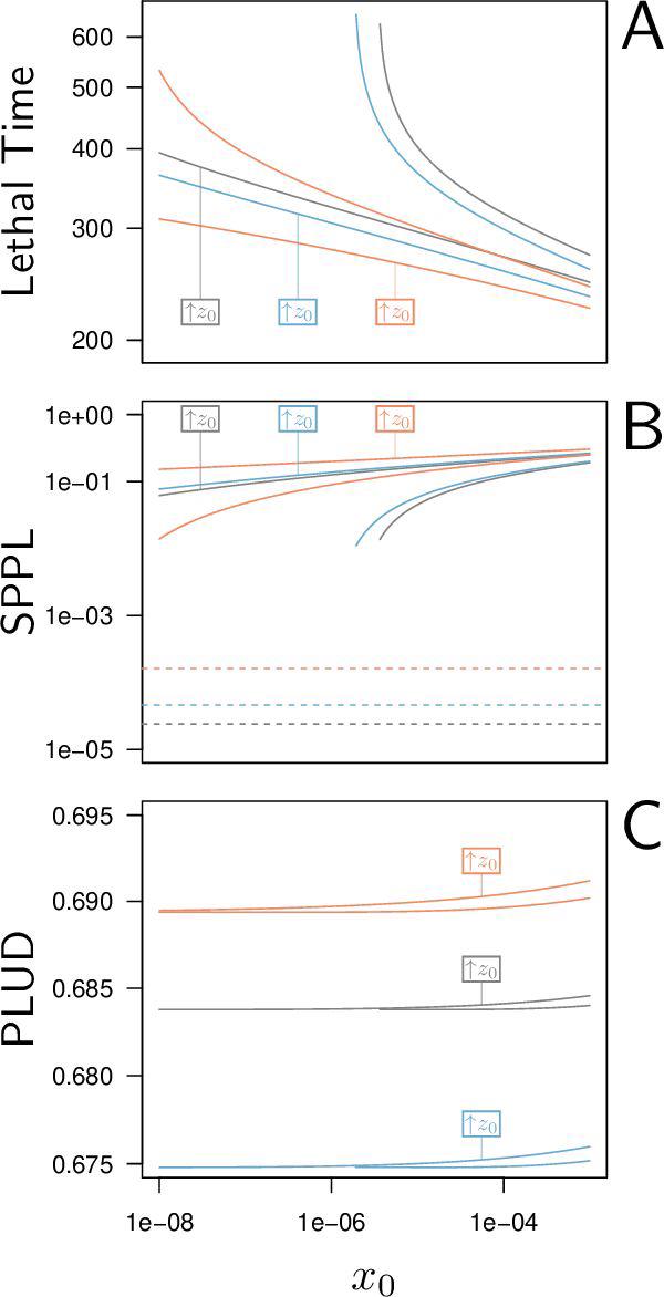 Our model predicts that PLUD should respond differently to changes in resistance and tolerance. This is because, during infection, pathogen load grows much faster than damage accumulates. When resistance is reduced, bacteria proliferate more freely and reach higher loads, but damage, which accumulates more slowly, has not yet reached the lethal threshold. By the time the host eventually dies, the bacterial load has climbed higher than it would have in a more resistant host: the PLUD increases. Conversely, when tolerance is reduced, the host reaches the lethal damage threshold sooner, at a point when bacteria have not yet grown as far: the PLUD decreases. Combined with a mortality measurement such as the Hazard Ratio (HR), the direction of change in PLUD can therefore help identify whether the source of susceptibility is a defect in resistance or in tolerance.