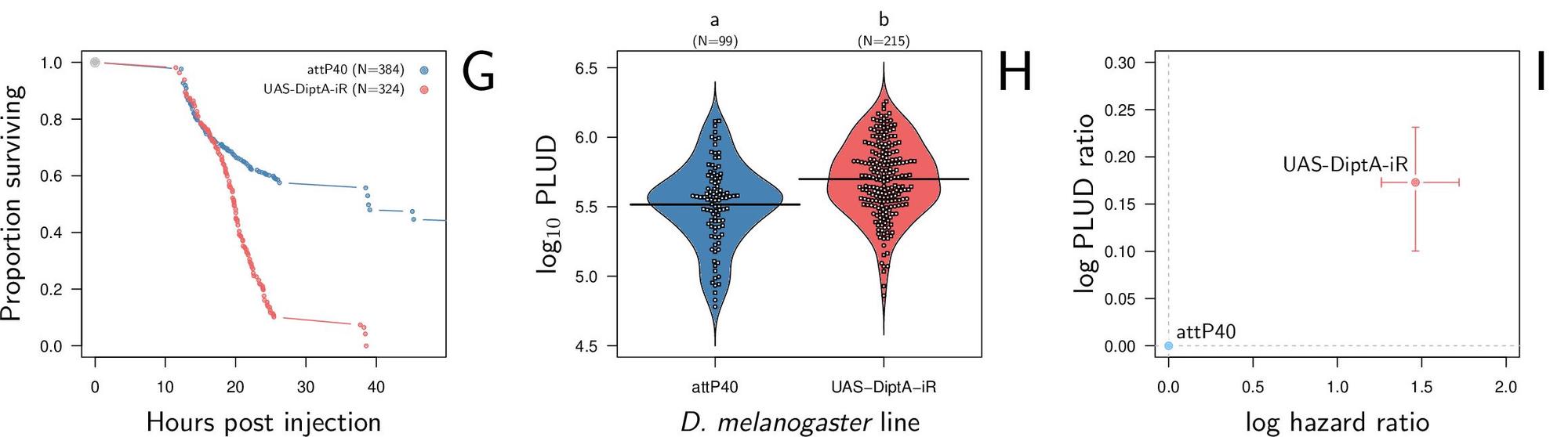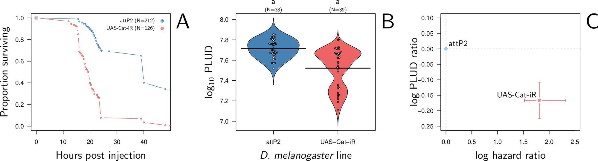 We validated the PLUD prediction experimentally using Drosophila melanogaster infected with Providencia rettgeri. First, we reduced resistance by deleting or silencing key antimicrobial peptides (Diptericin A). As expected, these flies died faster (higher HR) and at a higher PLUD, consistent with a resistance defect. Second, we silenced Catalase, an enzyme that protects cells from oxidative damage caused by reactive oxygen species. These flies also died faster (higher HR), but this time at a lower PLUD, consistent with a tolerance defect. The contrast between these two results (higher PLUD when resistance is impaired, lower PLUD when tolerance is impaired) demonstrates that combining PLUD and HR measurements can experimentally distinguish the two sources of susceptibility to infection.
